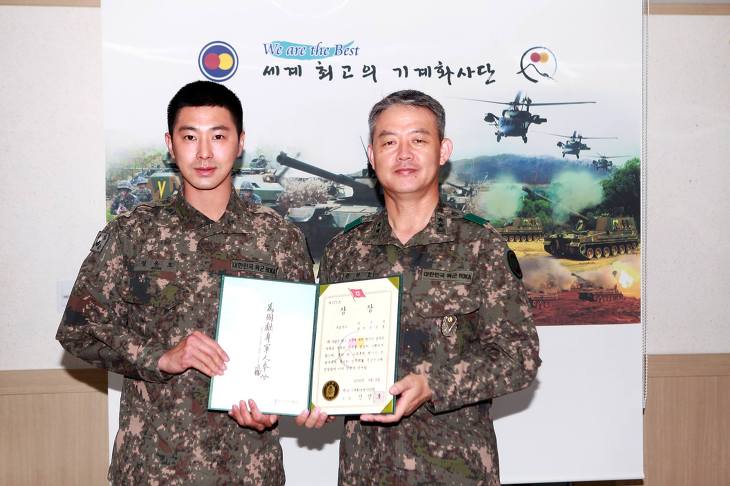 過去に芸能人で特級戦士に選ばれた人は何人もいるが、ユンホの場合は別格な扱いだった。なにしろ、陸軍の公式サイトには、第26師団のシン・イノ師団長とユンホのツーショット写真が華々しく掲載された。