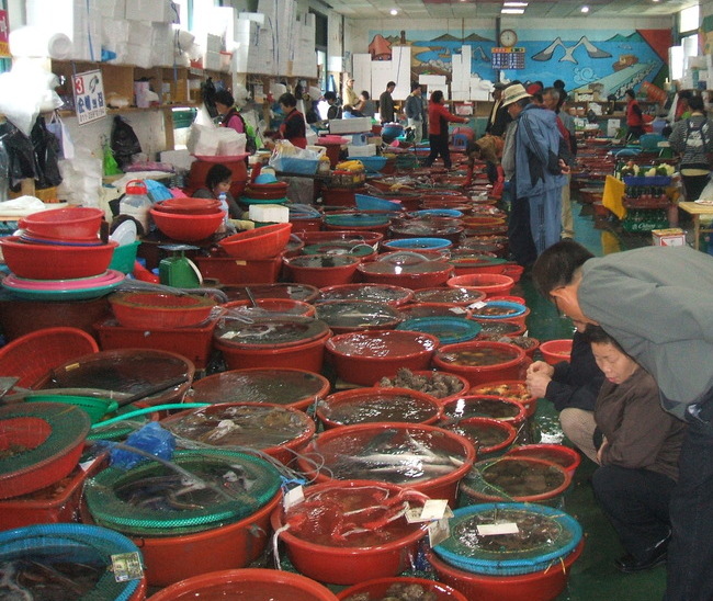 体育館のような建物の中に入ると、近海で採れた魚介類がたらいからあふれんばかりに並べられていた。タコ、イカ、ウナギ、スズキ、鯛、平目……。みんな活きがよさそうで、中にはピョンピョンはねてたらいから飛び出す魚がいる。そのたびに、アジュンマ(おばさん)が笑いながら魚を取り押さえていた。