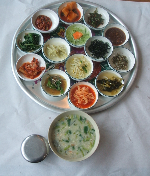 アッという間に、膳の上は皿に盛られた料理でいっぱいになった。キムチ類は白菜、カクテキ、大根の細切りの3種類、野菜のあえものはニラ、豆もやし、青とうがらし、ふき、青菜の5種類、塩辛はイカ、タラの内臓の2種類、それに、キュウリ、ノリ、小魚が加えられていた。それらをおかずにしてご飯を食べ始めたところで、煮込まれたウナギが運ばれてきた。