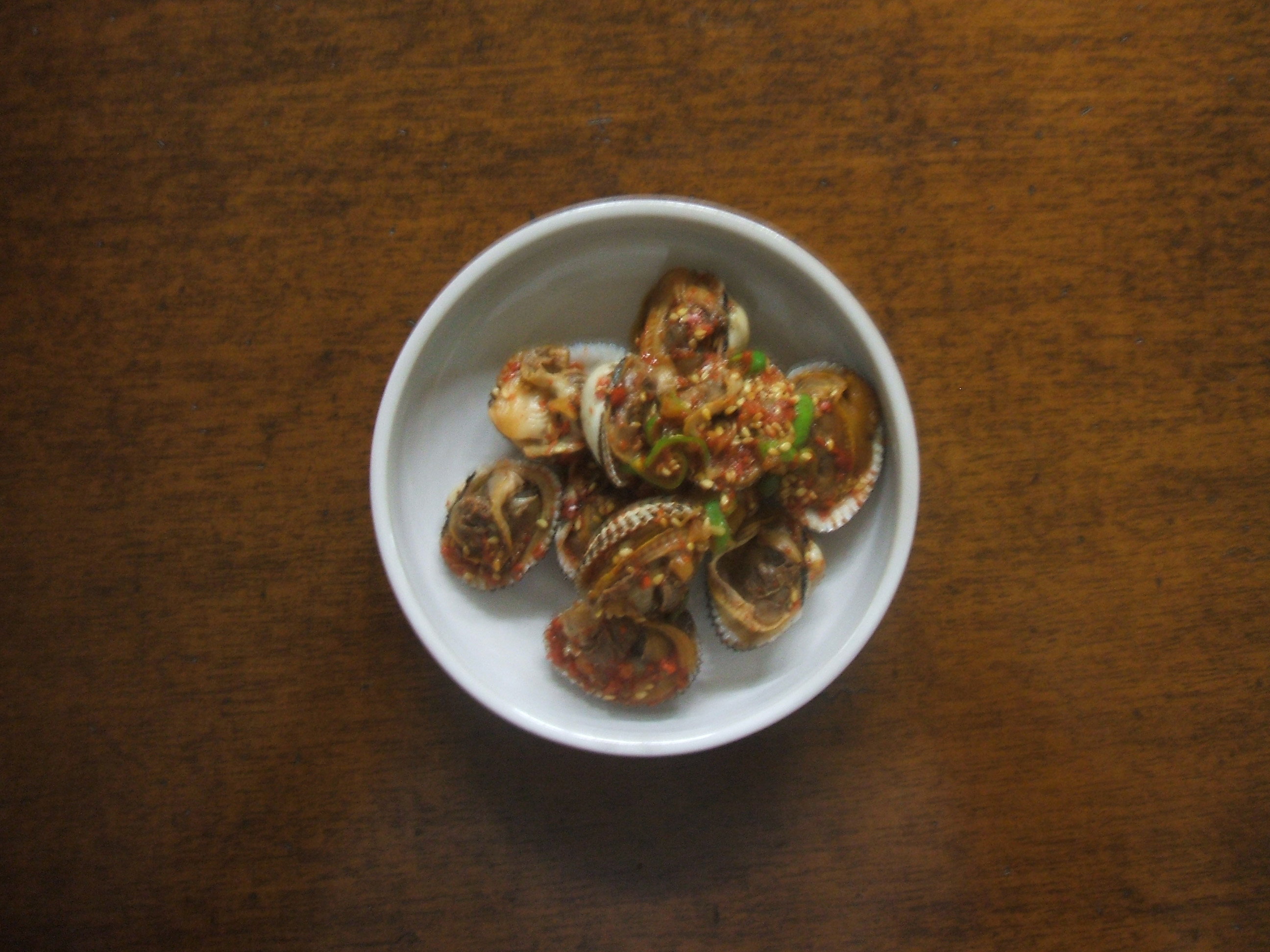 コマックと呼ばれる貝を水洗いし、軽く湯掻いたあとに、醤油、唐辛子の粉、きざみにんにく、ねぎ、ごま油などを混ぜ合わせた調味料をかける。貝からあふれ出る潮の香りに、濃い口の調味料の味わいが加わって、ご飯もよく進む。
