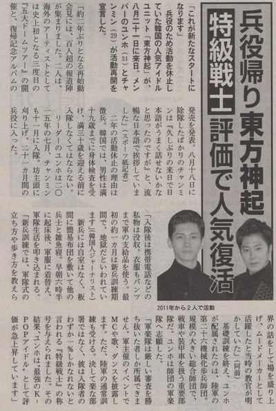 この記事は「兵役のため活動を休止していた韓国の人気アイドルユニット『東方神起』が、8月21日に来日。メンバーのユンホとチャンミンが活動再開を宣言した」というリード文で始まっている。