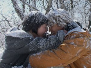 突然、ユジンが雪だんごを作って、前を歩くチュンサンに投げる。不意を打たれたチュンサンも負けてはいない。2人で愛の雪合戦だ。