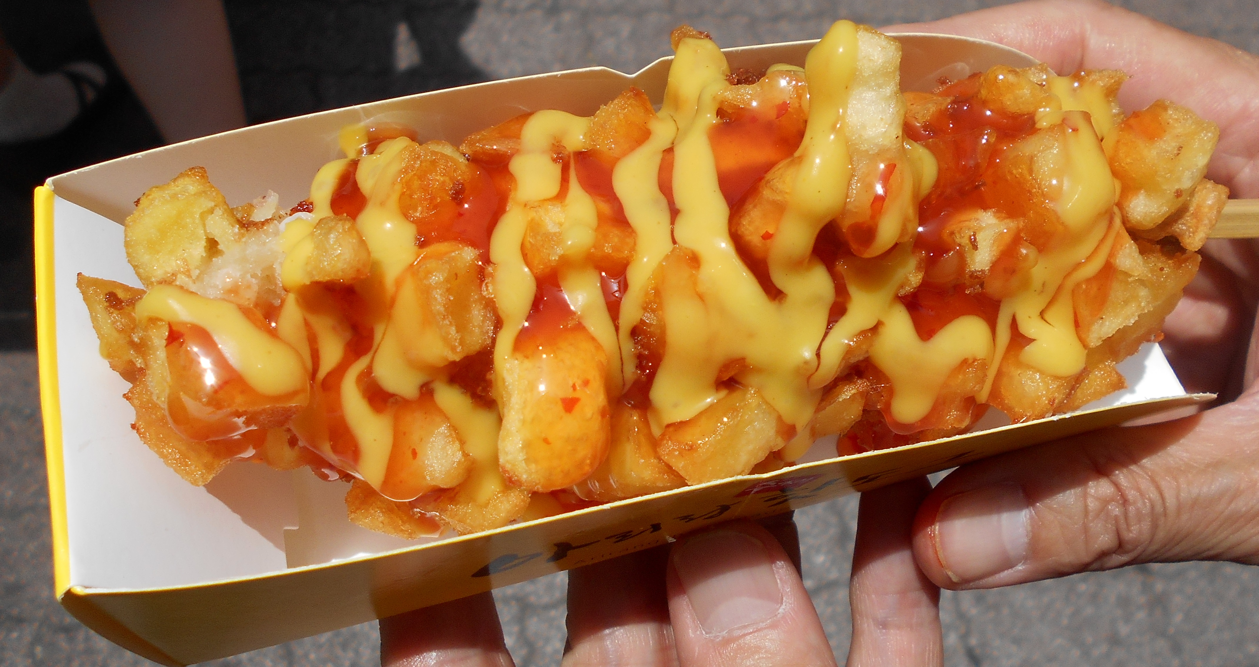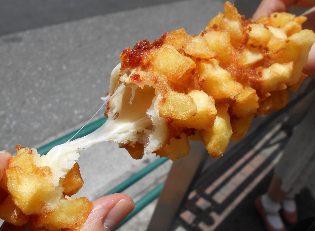 テレビの取材映像で見たように、ホットドッグの中に入っているチーズもよく伸びる。なんだか、うれしいね。