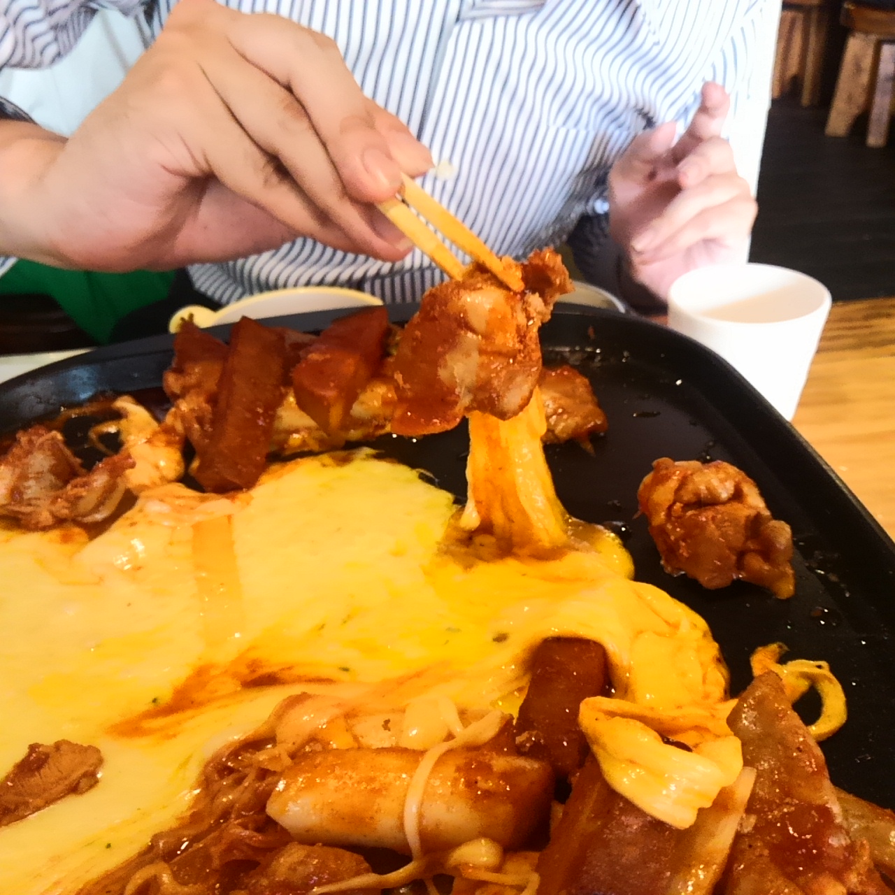 そうやって、チェダーチーズとモッツァレラチーズを個別に鶏肉にからめて食べたあと、次にチーズとタッカルビをピビンバ風に混ぜ合わせると、さらに違った食感と味が楽しめる。