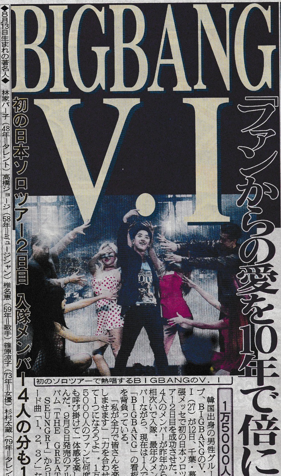 BIGBANGのV.Iのソロツアーを報じる2018年8月13日付けの「日刊スポーツ」