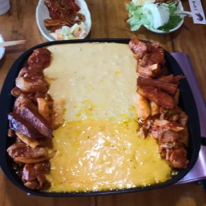 すぐに席を用意してくれてチーズタッカルビを頼んだ。モッツァレラチーズとチェダーチーズがたっぷり鉄板に盛られていて、タッカルビとよく混ぜ合わせてしっかりと食べた。本当に美味しい。