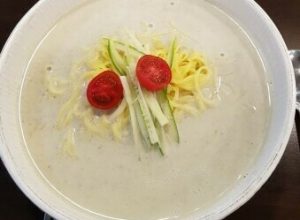 これが食堂のメニューに出てくると、夏の訪れを感じます。大豆を挽いてペースト状になった汁を冷麺にかけて食べる韓国人の夏のソウルフード。