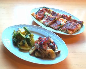 炒め物や揚げ物、和え物など多くの料理に適しているので、旬の野菜のキュウリ、ナスのナムルとズッキーニのチヂミを作ってみた。