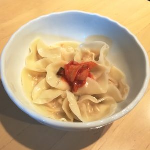 実際に作ってみると意外に簡単にできた。キムチと豚肉のもつ色々な旨味が餡に詰まり、豆腐のつなぎでとてもやわらかくツルツルしている。ネギの風味がさっぱりして飽きない美味しさだ。