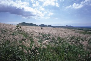 漢拏山東側に位置する火山、サングムブリ。噴火口付近のススキは絶景です。背の高い銀色のススキがチェジュ島の風に揺れる姿はまるで群舞が踊っているかのようです。