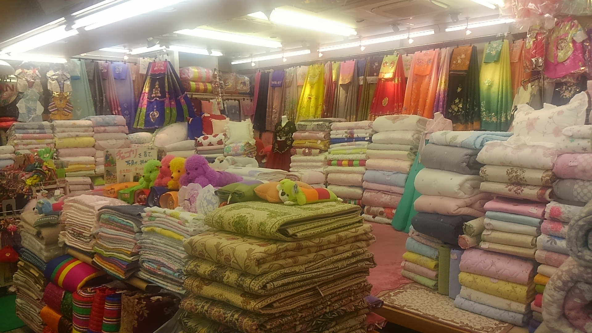 市場を歩いていて目立つのが、キムチをズラリと並べた食堂や、華やかなチョゴリで飾った服装店である。