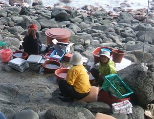 「海に出るときは、かんぴょうの中をくり抜いて乾かしたものを浮輪に使うの。潜っている間に浮輪が波間を漂ってしまうけど、水から上がると浮輪をたぐり寄せ、それにつかまってしばらく休む。海に浮かんでいるときは、ホント、気持ちがよかったよ。そして、何度か潜ったあとに海辺に上がり、焚き火に当たってからだを乾かす。落ちついたら、また海に入っていく。これを何度か繰り返すけど、潮が満ちてきたら終わり。その日に獲ったサザエやアワビを近くの加工工場に売りに行くのね。重さを量ってもらうと、その場で現金をくれる。これがうれしかった」