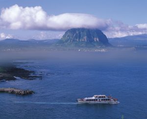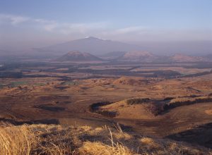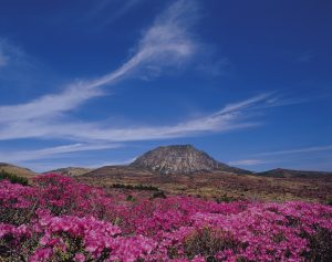 韓国最高峰の山がハルラサンです。標高は1950メートルで、楕円形の島の中央部に位置しています。