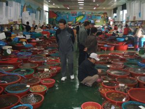 体育館のような建物の中に入ると、近海で採れた魚介類がたらいからあふれんばかりに並べられていた。タコ、イカ、ウナギ、スズキ、鯛、平目……。みんな活きがよさそうで、中にはピョンピョンとはねている魚がいた。そのたびに、市場のアジュンマが笑いながら魚を取り押さた。