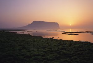 まず、景色を楽しむなら、絶対に行きたいのが済州島の東端にある城山(ソンサン)日出峰。ここは、海に突き出たところに立つ台形の山で、標高182mの頂上は3万坪の噴火口になっている。