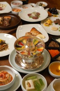 これは韓国独自の高級な鍋料理であり、使用される食材は牛肉、松の実、岩茸、胡桃、銀杏など豊かなバリエーションを誇っている。それらを巧みに組み合わせ、かまぼこ状に成形した後、中央に突起を持つ鍋に丁寧に並べ、牛肉の清湯を注ぎ入れる。そして、炭火でじっくりと煮込むのだ。色鮮やかな見た目は食欲を刺激し、牛肉のだしが効いており、上品な味わいが堪能できる。